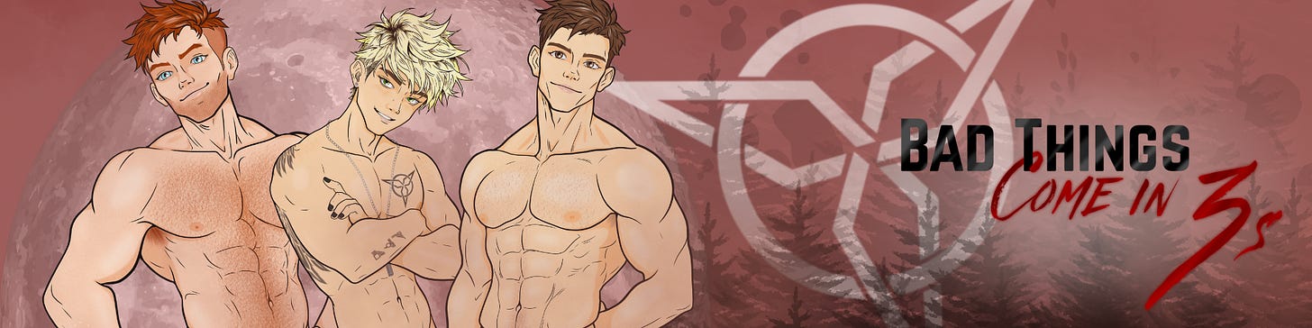 Bad Things Come in 3s is my upcoming MMM Paranormal Romance, starring a bratty witch (Hudson), his sort-of-but-not-really ex-boyfriend (Tyler), and a red headed werewolf with a heart of gold (Emery)!